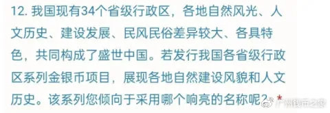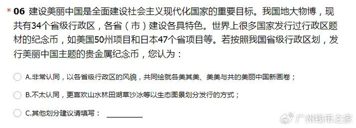 而且从今年的问卷看,明确提到会按照我国省级行政区划分,以美丽中国为主题,发行贵金属纪念币。