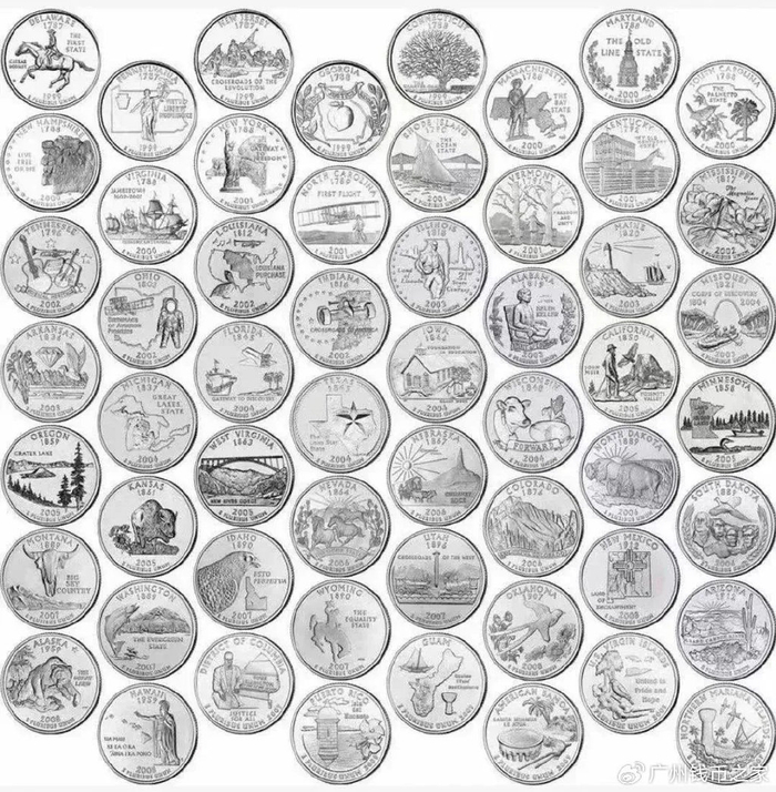 发行行政区纪念币,在我国还从未有过,但国外曾发行过类似的。比如美国50州项目: