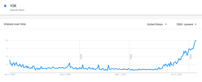 今年9月,Y2K的Google搜索指数攀升至历史峰值,较2020年2月增长426%,并且至今未出现任何回落迹象。早在2月,The New York Times如此形容这一时尚复兴,“2000年代早期的花哨和欢乐正在时尚界卷土重来”。