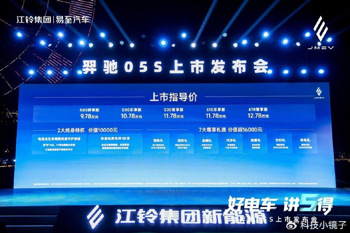 江铃集团新能源羿驰05S共推出5款配置车型,续航里程500km、610km,官方上市尊享价区间为9.78万—12.78万元,并推出“2大终身特权”与“7大尊享礼遇”上市权益,诚意满满。其中,终身特权涵盖电池全生命周期守护与免费终身保养1折享权益;尊享礼遇包括4000元增换购补贴、3000元特殊色车漆、5000元金融贴息等。