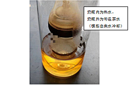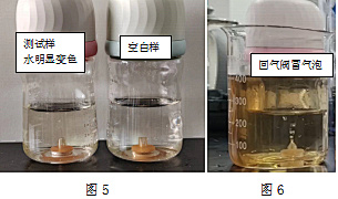 图5中左侧为测试样,右侧为空白样(没有测试过,仅加入常温饮用水的样品),可以明显观察到左侧奶瓶中的水变色,有一定量的茶水倒吸到奶瓶中。图6为测试过程中产生回气阀的冒气泡现象,外侧的茶水倒吸进入奶瓶中。