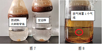 图7中左侧为测试样,右侧为空白样(没有测试过,仅加入常温饮用水的样品),可以观察到左侧奶瓶中的水轻微变色,有少量的茶水倒吸到奶瓶中。图8为测试过程中回气阀冒1个气泡的图片,外侧的茶水有少量进入奶瓶中。