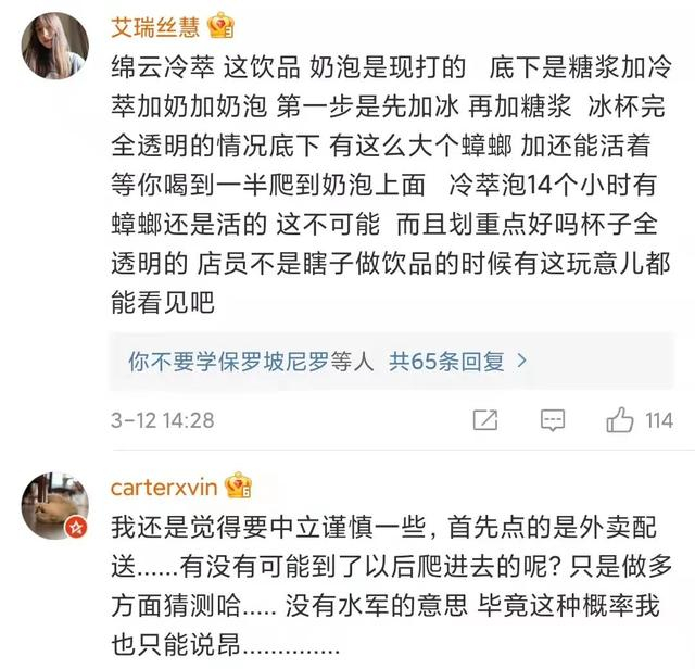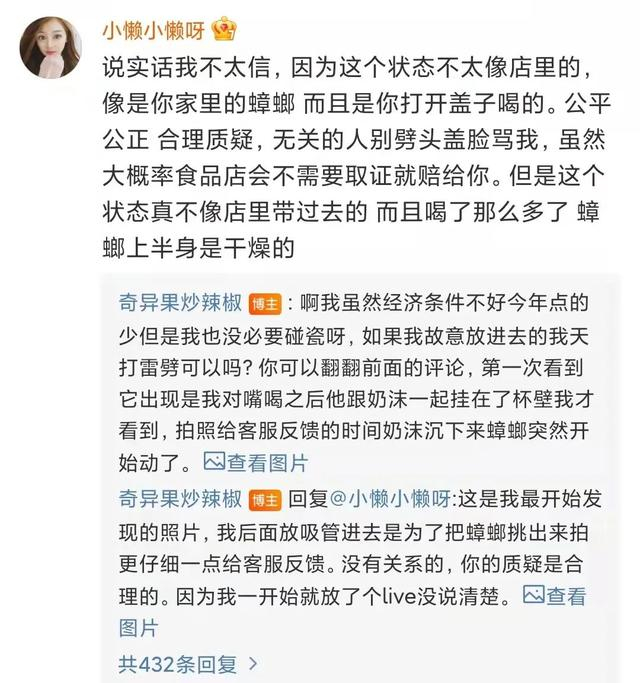 博主自曝,同样是去年3月,同样是这家店,同样是这款产品,同样喝到了一只蟑螂!