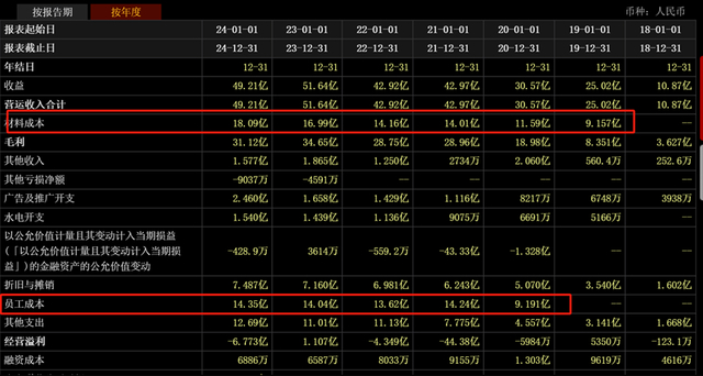 奈雪的茶长期依赖的直营模式成为业绩拖累。截至 2024 年 6 月,其一线及新一线城市直营门店占比达 70.4%,单店面积普遍在 100 平方米以上,且一线城市“过度加密”,如上海部分商圈500米半径内超3家奈雪,客源被稀释。这种 “高端化 + 大店” 策略导致成本居高不下:2024 年材料成本高达18.09亿元,占营收比重36.8%,显著高于同行水平(如蜜雪冰城材料成本占比30%,古茗约32%),员工成本占比从 27.2% 升至 29.2%,仅这两项成本就增加了 1.41 亿元。与之形成对比的是,蜜雪冰城通过自建供应链将材料成本压缩至 30% 以下,古茗则通过区域加盟实现单店投资回报率超 25%。