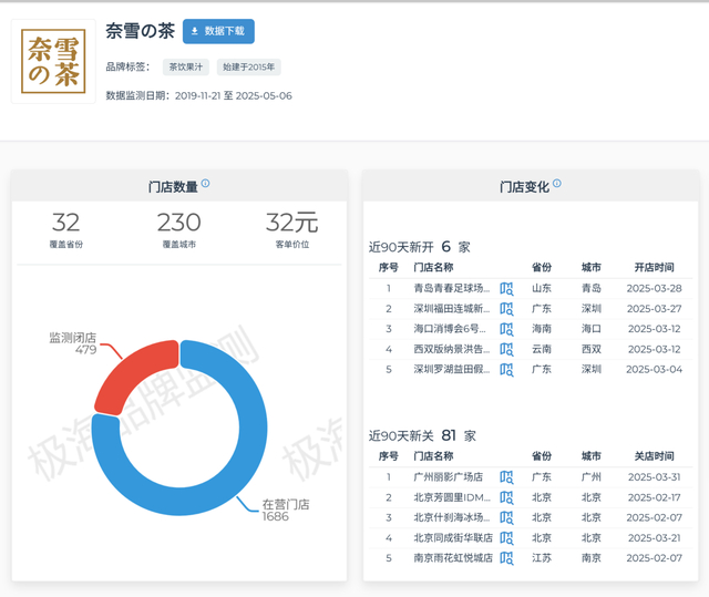在消费降级趋势下,高成本模式难以为继。2024 年奈雪的茶关闭 121 家直营店,其中第三季度单季关店 89 家,一线城市门店经营利润率仅 1.4%-2.2%。有关数据显示,2024 年第二季度其直营店净增长为 0,关闭 48 家,而同期蜜雪冰城、茶百道等品牌通过加盟模式实现门店数量翻倍。