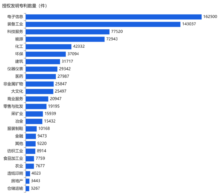 从授权发明专利产业分布来看,近一年,电子信息、装备工业、科技服务行业新增数量较多,分别新增专利162,500件、143,027件、77,520件。