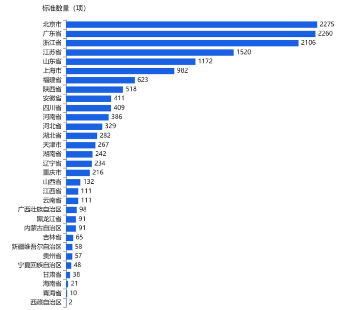 从新增国家标准区域分布来看,北京市、广东省、浙江省民营企业新增数量较多,分别为2,275项、2,260项、2,106项。