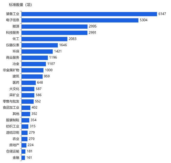 从新增国家标准产业分布来看,近一年,装备工业、电子信息、能源行业民营企业新增数量较多,分别有6,147项、5,304项、2,995项。