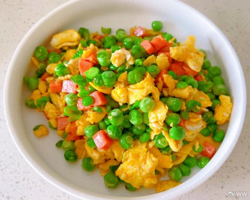 新豌豆炒蛋新鲜豌豆正当季,圆润翠绿,炒鸡蛋不折不扣是餐桌上的常客。豌豆先用开水焯一遍,滤水后加蛋液同炒,不加繁复调料,自然有甘甜豆香。