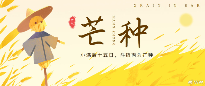 在二十四节气里,芒种排第九,是夏季的第三个节气。每年公历六月五日至七日之间,太阳一照,天地一热,“斗指丙,太阳黄经达75°”,芒种便来了。芒,是麦子、谷子等有芒作物籽粒顶尖上的那根小刺;种,则是播种新希望。顾名思义,这时要“收麦种稻”,有芒的麦子快收,该播有芒的稻子了。