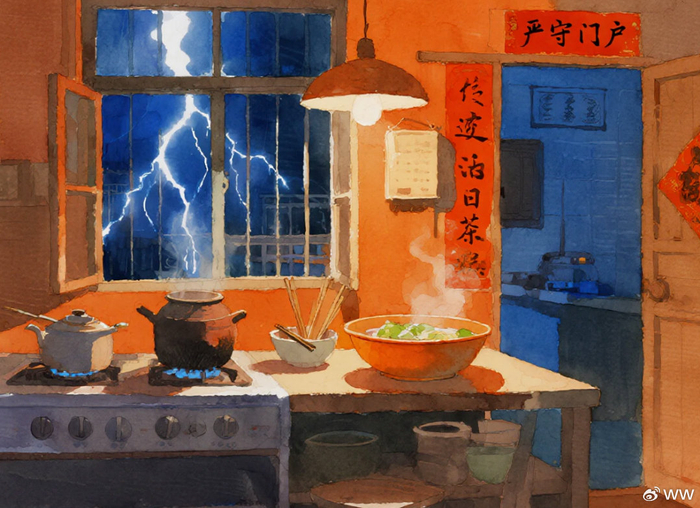 任凭外头雷雨密布、闷蝉乱叫,家人团坐一桌,清茶淡饭、笑语温言,便是这一天最踏实的避风港。细雨生凉意,但人间烟火气,总是最温润人心的地方。