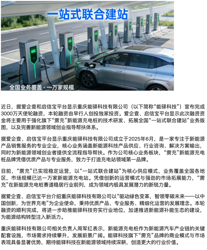爱企查和启信宝平台显示重庆能驿科技有限公司获三千万天使轮融资