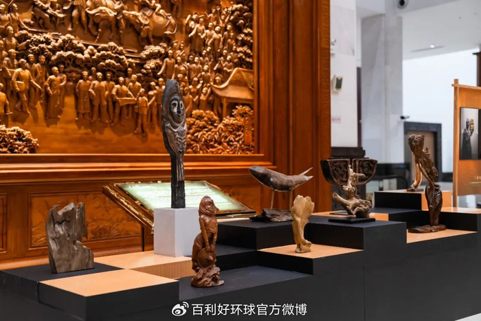 在木雕艺术交流区的东阳木雕展区中,东阳木雕精品尽显“国之瑰宝”的深厚底蕴。樟木浮雕上的戏曲纹样层次清晰,透空雕技法传递出江南的灵秀气质。这些凝结着儒家文化与工匠精神的作品,与对面的非洲木雕形成有趣的对照。非洲展品由东阳木雕博物馆提供,乌木面具线条粗放、图腾神秘,每一件都散发着“万物有灵”的原始气息。