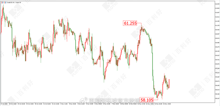 技术面:原油昨日在下跌后维持低位震荡,小时图从10月24日以来保持震荡下行,下跌结构仍未改变,表现偏弱势。短线来看,预计继续维持低位震荡的概率大,上方关注59.30美元的阻力,下方关注58美元一线的支撑。