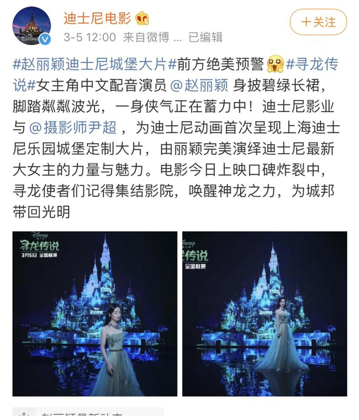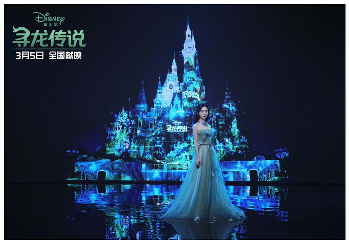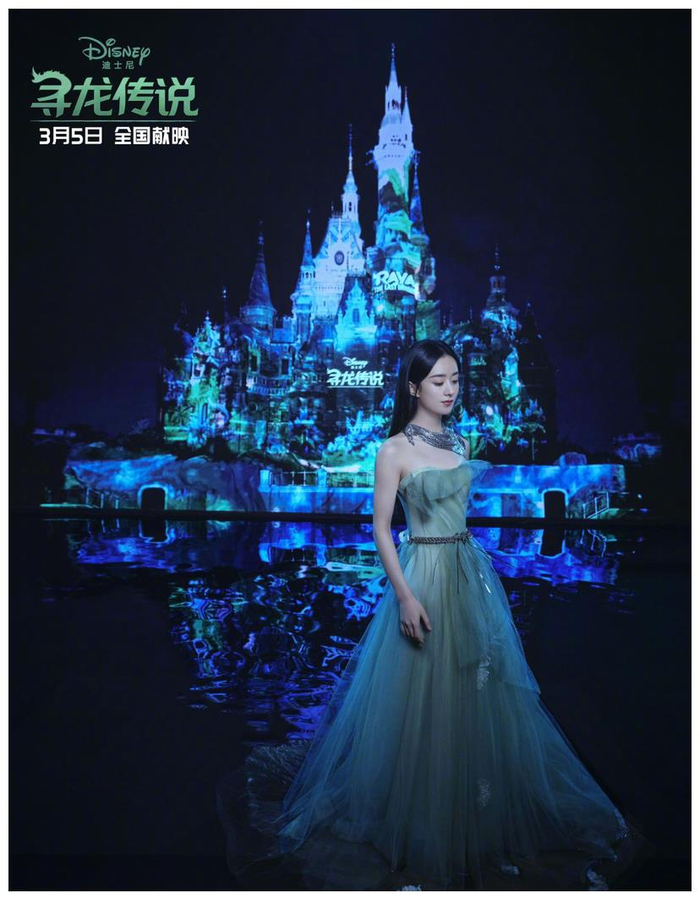 同一天,迪士尼电影发布电影《寻龙传说》女主角拉雅中文配音演员赵丽颖迪士尼城堡定制大片。
