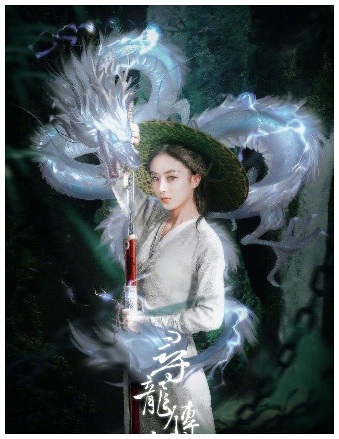 照片中,赵丽颖身着碧绿长裙,脚踏粼粼波光,一身侠气。