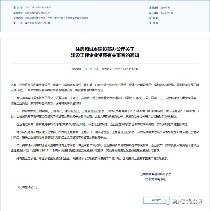 一、我部核发的工程勘察、工程设计、建筑业企业、工程监理企业资质,资质证书有效期于2023年12月30日前期满的,统一延期至2023年12月31日。上述资质有效期将在全国建筑市场监管公共服务平台自动延期,企业无需换领资质证书,原资质证书仍可用于工程招标投标等活动。