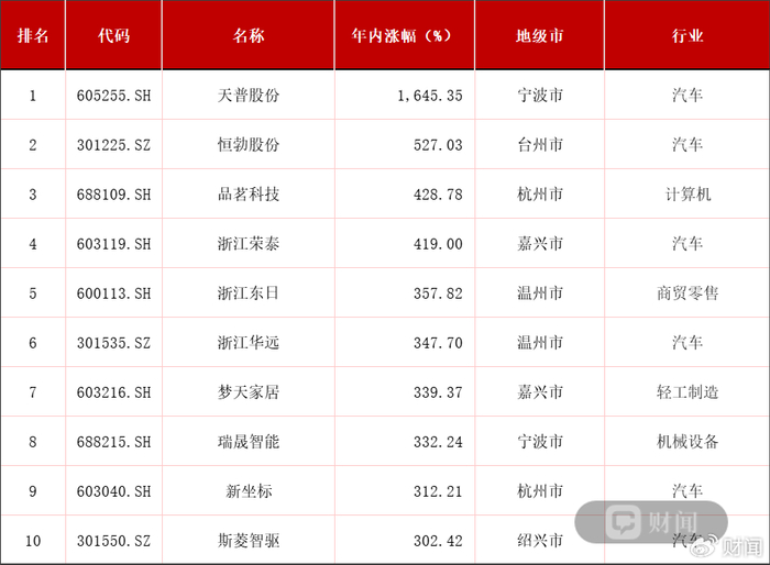 个股方面,财闻据同花顺iFinD数据统计,2025年全年股价涨幅最大的浙股为天普股份,年内涨1645.35%(前复权,下同)。
