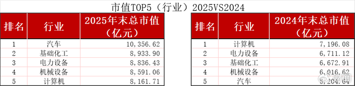 按行业看,截至2025年末,汽车行业浙股总市值近1.04万亿元,在31个申万一级行业中位列第一。2024年末,汽车行业浙股总市值还仅为 5204.64亿元,年内几乎翻倍。其中拓普集团(601689.SH)、万向钱潮(000559.SZ)、浙江荣泰(603119.SH)等汽车行业浙股市值增加达百亿,另外年内新上市的中策橡胶(603049.SH)同样有所贡献。