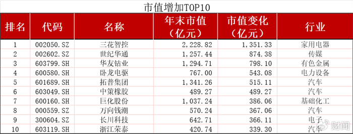 按市值年内增加看,2025年市值增加最多的浙股为机器人概念股三花智控,其市值从年初的877.48亿元增加了1351.33亿元至2228.82亿元。