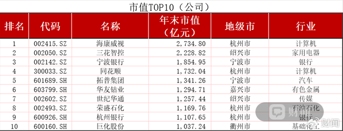 按市值来看,截至2025年末,总市值最高的浙股分别为海康威视(002415.SZ)、三花智控(002050.SZ)、宁波银行(002142.SZ)、同花顺(300033.SZ)、拓普集团(601689.SH)、华友钴业(603799.SH)、世纪华通(002602.SZ)、荣盛石化(002493.SZ)、杭州银行(600926.SH)、巨化股份(600160.SH)。
