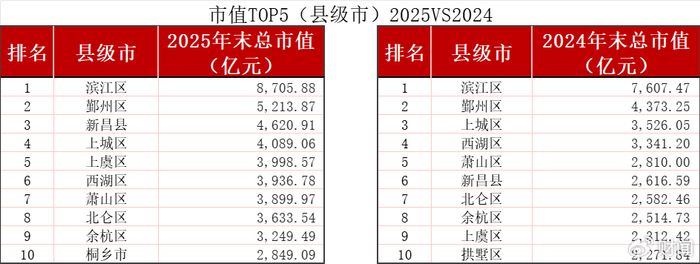 从县级区市维度看,前三甲格局有所改变。截至2025年末,杭州市滨江区、宁波市鄞州区、绍兴市新昌县的上市公司总市值规模分别位列前三甲。年初这一排位还是滨江区、鄞州区和杭州市上城区。财闻注意到,三花智控的注册地正是绍兴市新昌县,其市值增加助力新昌县上市公司总市值规模的提升。