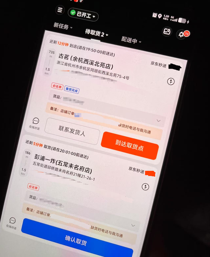 但在操作上,张鹏认为,“京东外卖送单有点麻烦”。他给银柿财经发来一段录制视频显示,他接到的某个订单,系统要求在14分钟内前往商家取餐,赶到之后要点击“到达取货点”“确认取货”等,商品送达时还必须拍照上传到平台。