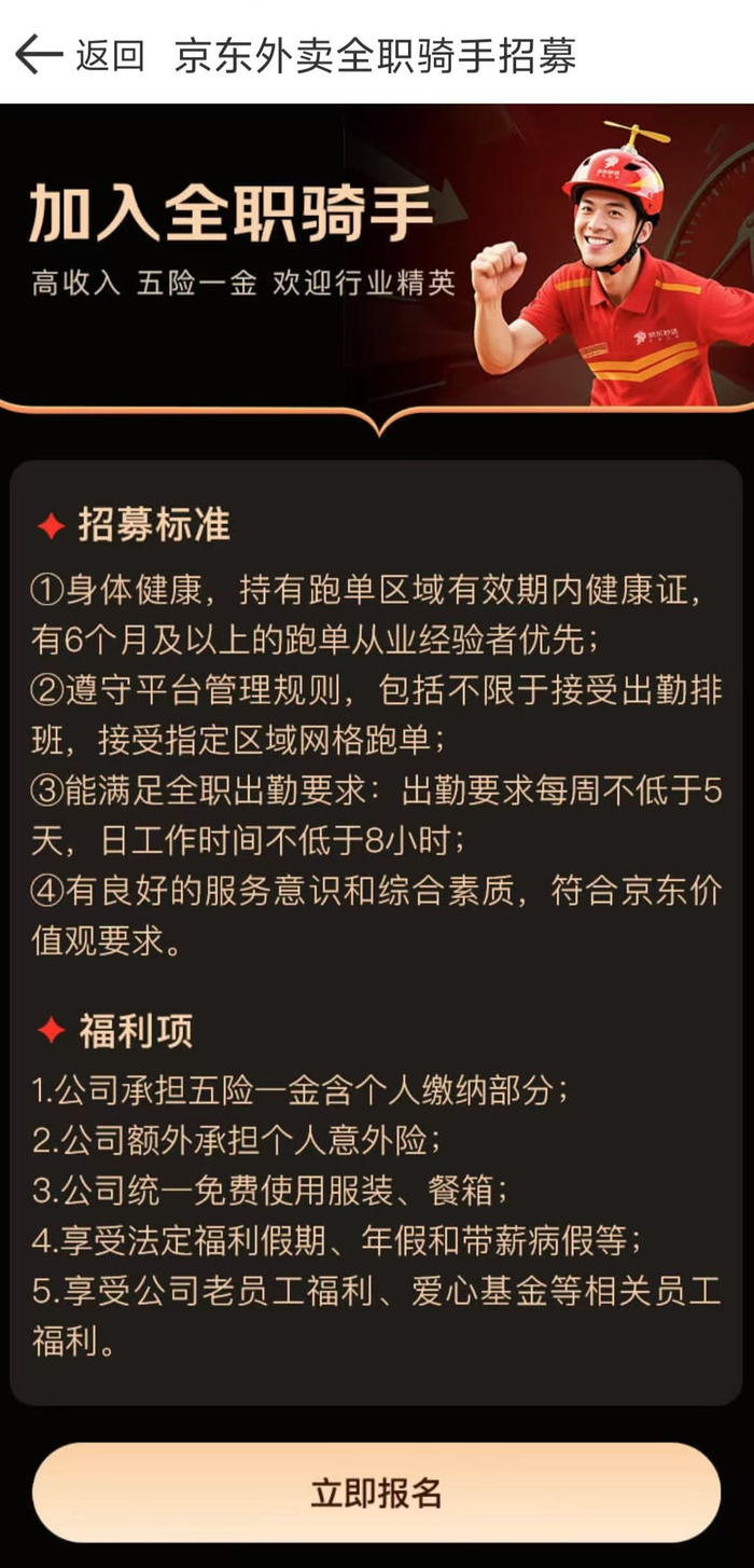 京东外卖全职骑手招募海报那么,骑手们如何看待京东外卖?其实,他们最关心的还是收入、福利等变化。对于“五险一金”,这些众包骑手态度不一。
