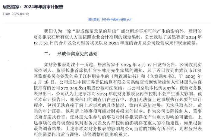 居然智家的年报审计机构称:“作为公司实际控制人、董事长兼首席执行官,汪林朋参与的事项对财务报表存在产生重大影响的可能性,上述事项的最终调查结果对财务报表及内部控制的影响存在重大的不确定性。”