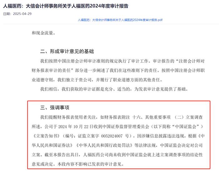 银柿财经注意到,上述11家公司的审计报告出现强调事项段的原因存在共性。多家公司因公司或实控人被立案,且截至审计报告出具日立案调查事项尚未有定论出现强调事项段。如人福医药、三七互娱、豆神教育、诺泰生物、*ST合泰。