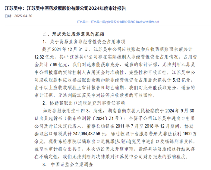 *ST苏吴2024年被出具无法表示意见的审计报告的原因