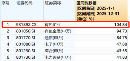 在刚刚过去的2025年,有色金属板块表现强势。有色金属板块年内涨幅94.73%,位居申万一级行业首位。有色矿业ETF招商(159690)跟踪的中证有色金属矿业指数年内涨幅达104.84%,相对弹性更佳。