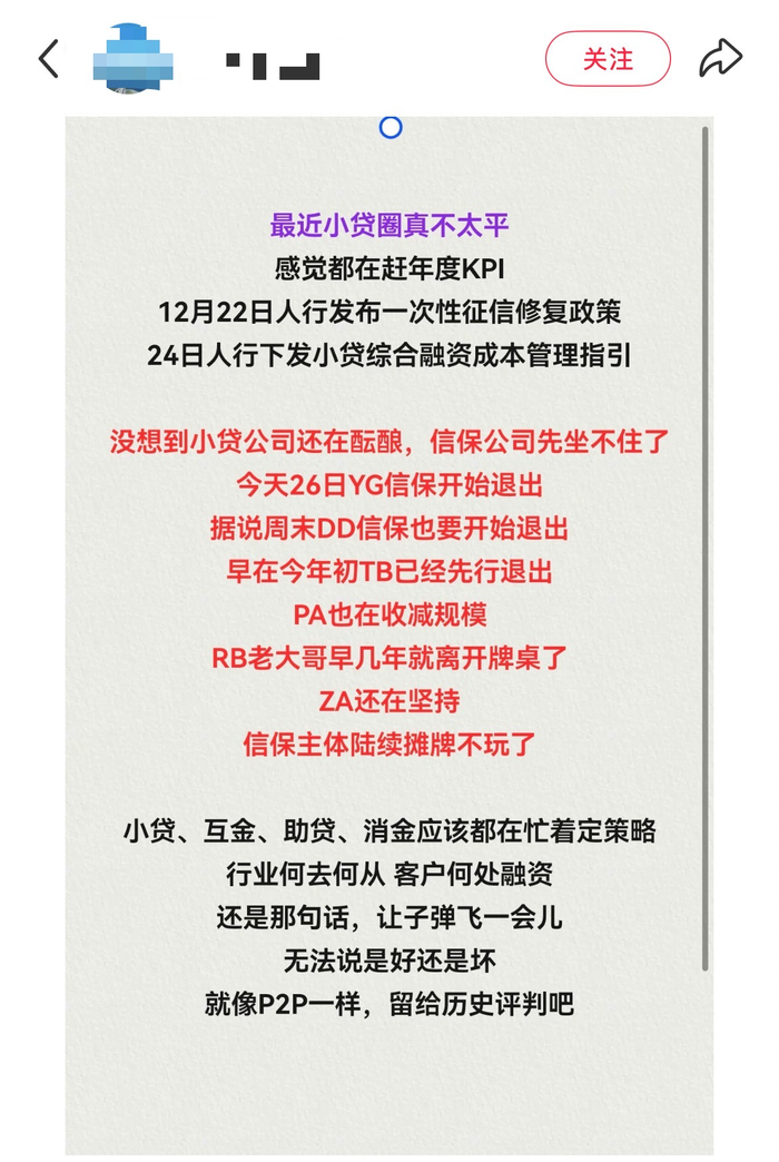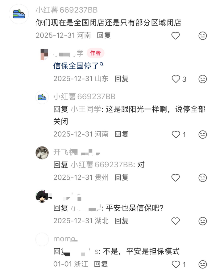 图片截取自社交平台。知情人士对财闻证实,2025年12月,央行相继发布“一次性征信修复政策”和“小贷综合融资成本管理指引政策”后,对融资性信保业务影响较大,大地保险和阳光财险确实关停了。