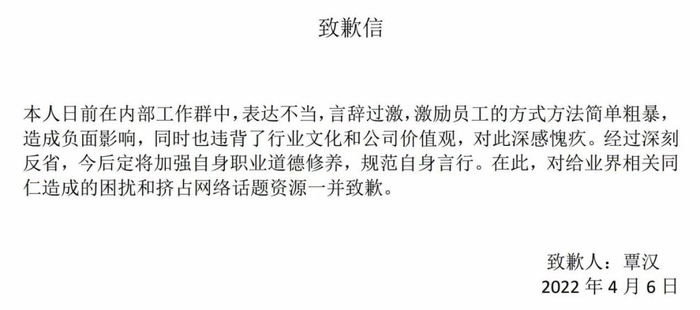 图片来源网络该言论在社交媒体持续发酵后,覃汉随即发布致歉信。他在信中表示:“本人日前在内部工作群中,表达不当,言辞过激,激励员工的方式方法简单粗暴,造成负面影响,同时也违背了行业文化和公司价值观,对此深感愧疚。经过深刻反省,今后定将加强自身职业道德修养,规范自身言行。在此,对给业界相关同仁造成的困扰和挤占网络话题资源一并致歉。”