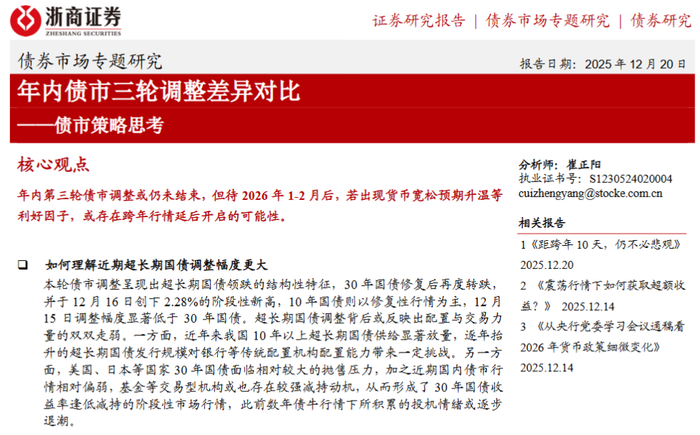 根据浙商证券固收团队发布的正式研究报告,覃汉的姓名最后一次出现在分析师署名栏是在2025年12月12日,相关报告题为《债市策略思考:如何理解重要会议后TL高开低走?》。而在12月20日发布的题为《债市策略思考:年内债市三轮调整差异对比》的研报中,虽然作者处仍列有覃汉,但分析师栏目仅标注崔正阳一人。