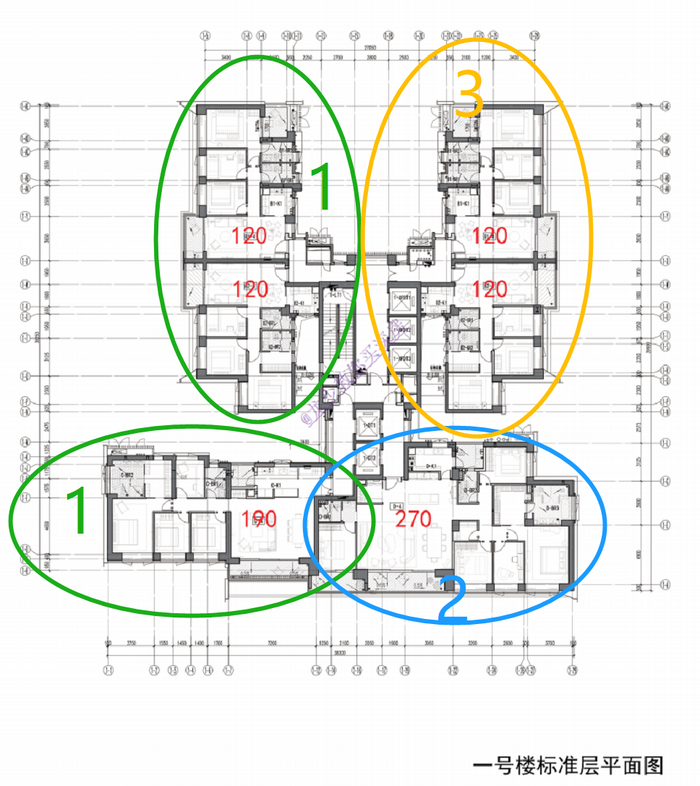 楼校长也以1号楼为例(二至四号楼布局类似,只是190平户型位置其他楼栋均为120平),给户型按照从优到劣排了一个序,1为优选,3为最次选: