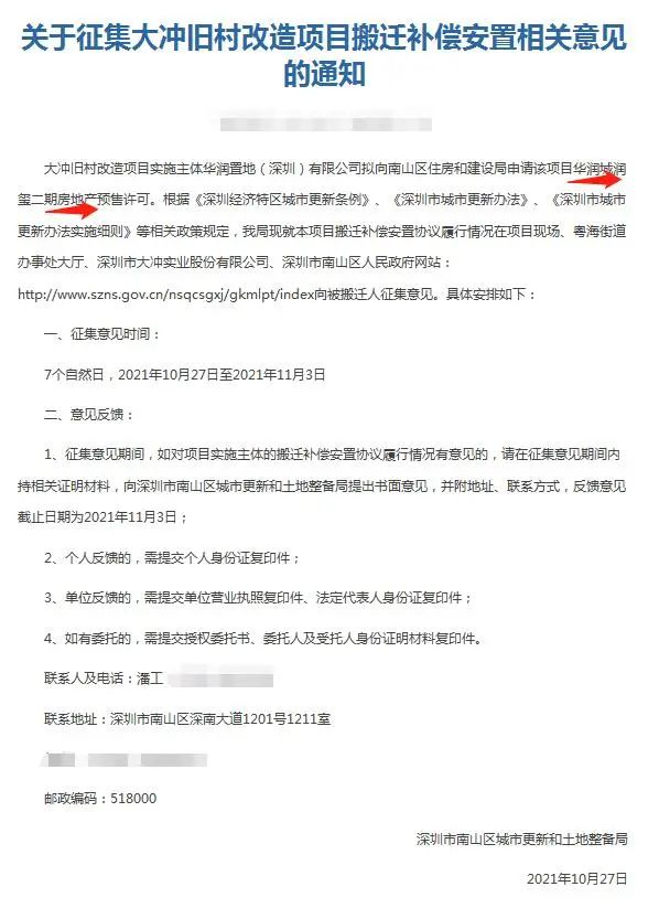 10月27日,在南山区城市更新和土地整备局公布的《关于征流出集大冲旧村改造项目搬迁补偿安置相关意见的通知》中披露:“大冲旧村改造项目实施主体华润置业(深圳)有限公司拟向南山区住房和建设局申请该项目华润城润玺二期房地产预售许可。”