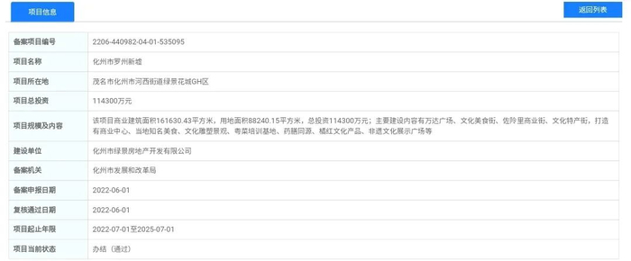 目前罗州新墟备案已经通过,由绿景集团总投资11.43亿,商业建筑面积161630.43平方米,用地面积88240.15平方米,主要建设内容有万达广场、文化美食街、佐阾里商业街、文化特产街,打造有商业中心、当地知名美食、文化雕塑景观、粤菜培训基地、药膳同源、橘红文化产品、非遗文化展示广场等。