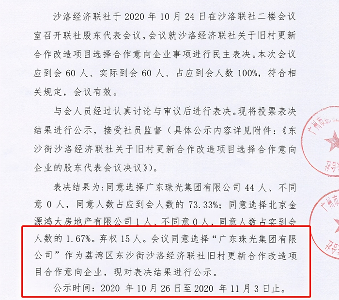 10月26日,东沙街沙洛经济联社关于旧村更新改造项目选择合作意向企业、《沙洛经济联社旧村更新合作改造项目合作意向协议书》表决结果公示,确定广东珠光集团有限公司为该项目合作意向企业;该村三旧改造标图建库面积41万平方米,现状建筑面积35万平方米。