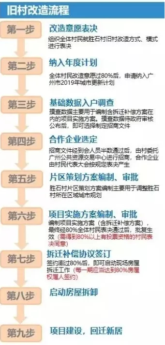 由于涉及全体村民的利益关系,旧改的流程繁多复杂,牵涉多方面的利益关系,所以完成一条村的旧改,时间十分漫长。下面以胜石村为例简单介绍一下旧改的流程。