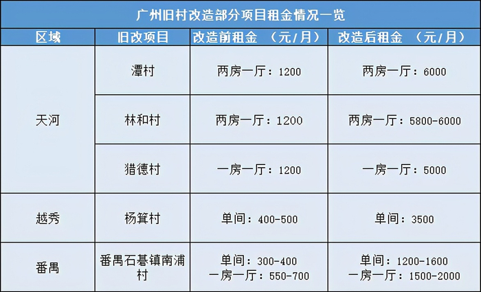 参考广州城中村改造较为成功的潭村、杨箕、猎德、琶洲,改造前后的租金对比就非常明显。