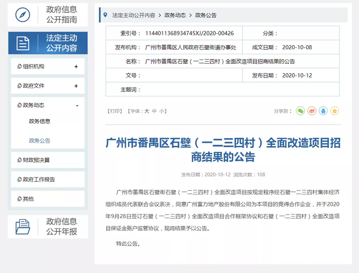 同年8月19日钟村邻近的石壁街(一二三四村)召开集体经济组织成员代表联合会议,经过两轮激烈竞投,富力地产以赞成票数217票,赞成率80.66%,竞得石壁一二三四村全面改造项目合作企业资格。涉及总用地面积104.8万㎡,总投资预算120亿元。