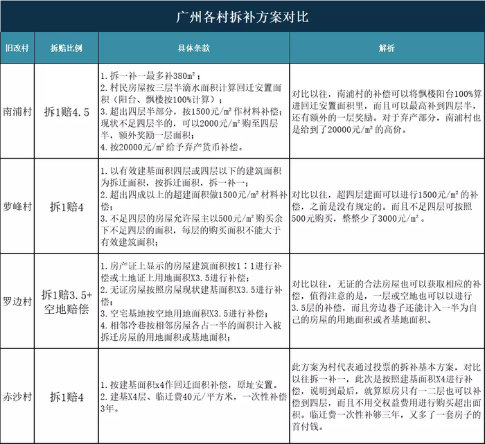 以前的旧改拆补方案,由于没有太多政策支持,大多是采用征地的补偿方案进行,补偿方式较为单一,拆赔方案多数是拆1赔3.5。如果是政府主导的整村征迁,像番禺曾边村,就只有1赔3。