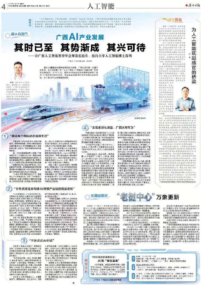 在全球人工智能浪潮奔涌、深刻重塑产业与发展格局的时代背景下,11月5日,广西日报在全国省级党报中率先推出“人工智能专刊”,每周三推出一期,旨在以内容创新呼应科技变革,以版面实践彰显责任担当,为广西打造中国—东盟人工智能合作高地汇聚智慧、注入动能。