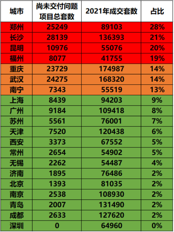 郑州未交付的问题项目达25249套,占比约28%,大中城市里列第一;
