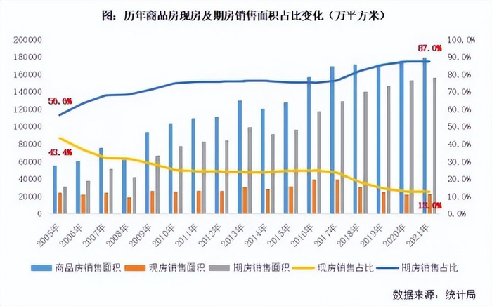 2021年,现房销售比重只剩下13%,其余87%的房源均采用预售制销售。