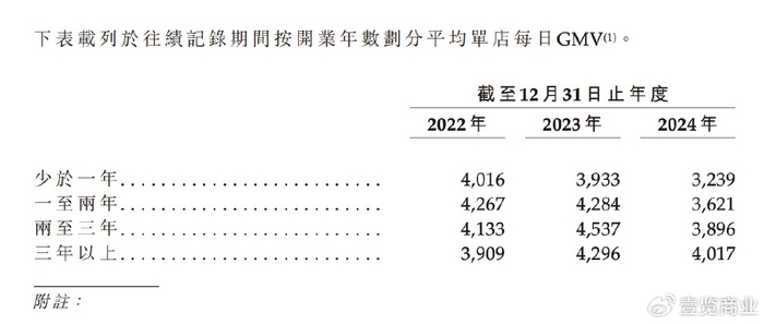 第一组是,少于一年、一至两年、两至三年的店,2024年单店日销售分别同比下滑了17.65%、15.48%和14.13%,只有三年以上的“老店”下滑相对较少,为6.49%。