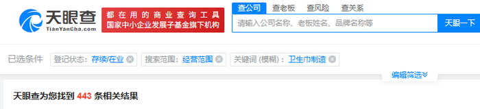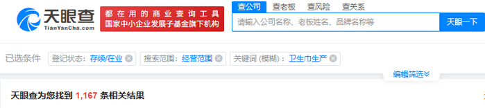 据天眼查数据,截至2025年4月22日,全国目前存续/在业的、经营范围包含“卫生巾制造”的企业有400多家;目前存续/在业的、经营范围包含“卫生巾生产”的企业有1000多家。