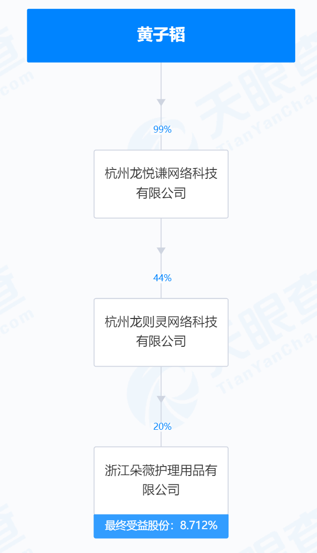 黄子韬通过其名下的杭州龙悦谦网络科技有限公司间接持有浙江朵薇护理用品有限公司的股权。此外,浙江朵薇护理用品有限公司还在近日成为杭州朵薇卫生用品有限公司的新股东,取代了原股东杭州千芝雅卫生用品有限公司。
