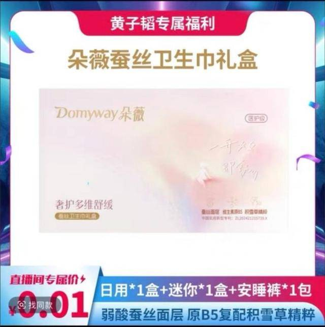 ▲黄子韬卫生巾直播间专属价0.01元黄子韬此次销售的卫生巾产品为“朵薇蚕丝医护级卫生巾礼盒”,由浙江朵薇护理用品有限公司生产。天眼查显示,浙江朵薇护理用品有限公司成立于2021年6月,法定代表人为徐嘉斌,注册资本1000万元人民币,经营范围包括卫生用品和一次性使用医疗用品生产、货物进出口、纸制品制造等。2022年9月获得“卫生巾、卫生护垫,尿裤,尿布(垫、纸),化妆棉(纸、巾)”的生产许可。